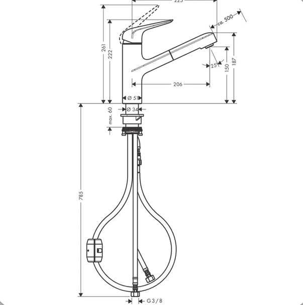 Caractéristiques techniques du mitigeur de cuisine Hansgrohe Focus M42 150